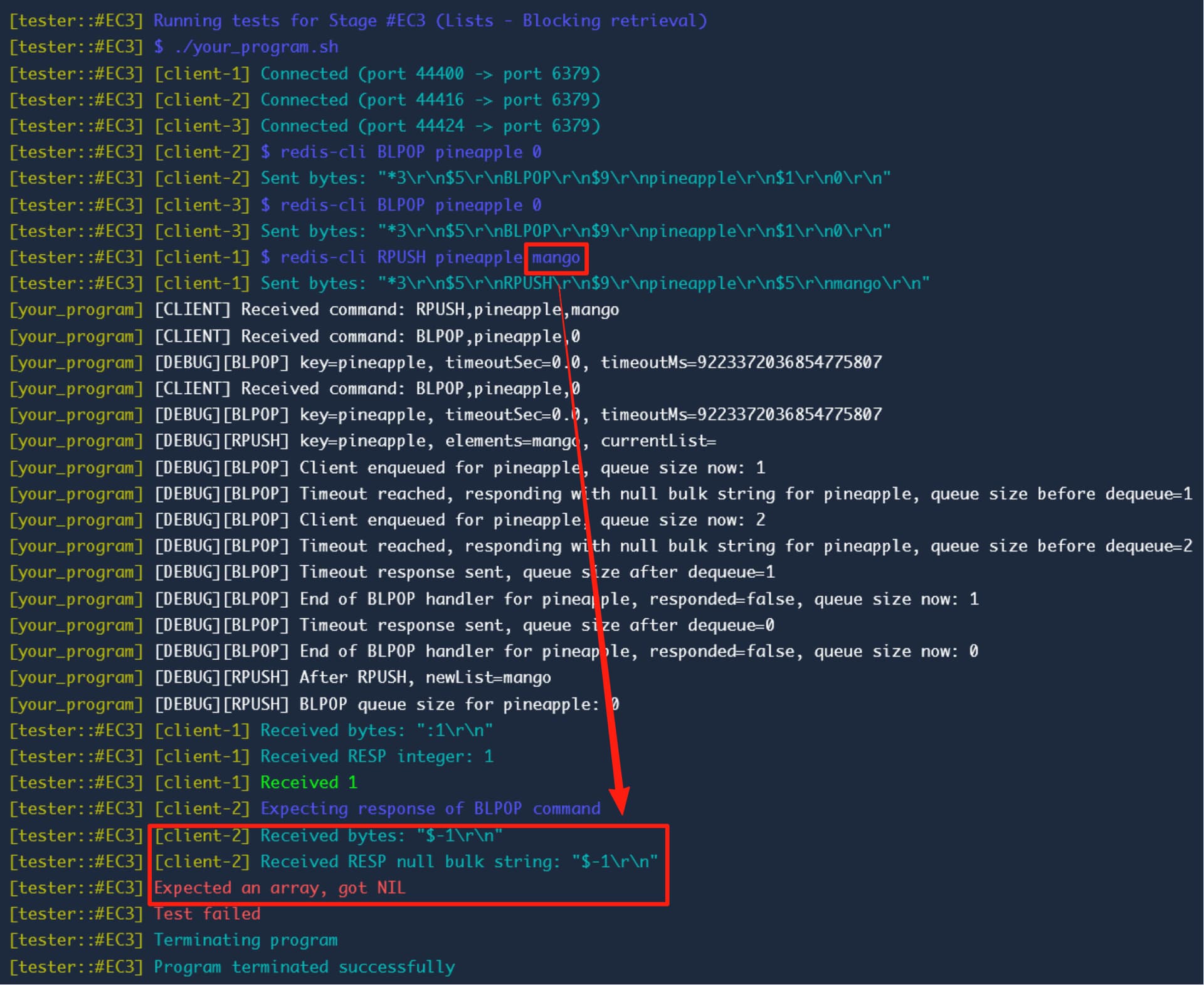 Looking at the screenshot for #EC3, the server should return [“pineapple”, “mango”] to client-2, since “mango” was just pushed by redis-cli: